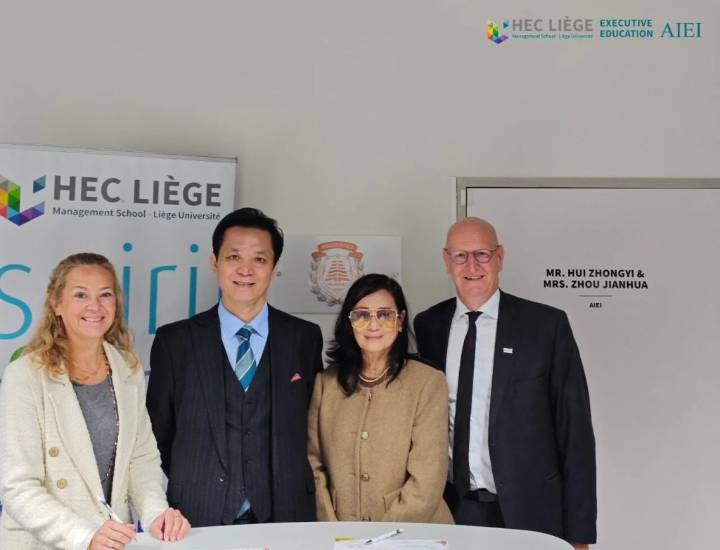▲HEC列日高商在职学位教育项目中国管理中心富有国际教育AIEI总负责人回重屹教授、总运营官Joan女士和HEC列日高商院长威尔弗里德·尼森教授在以AIEI命名的多媒体教室前合影留念。