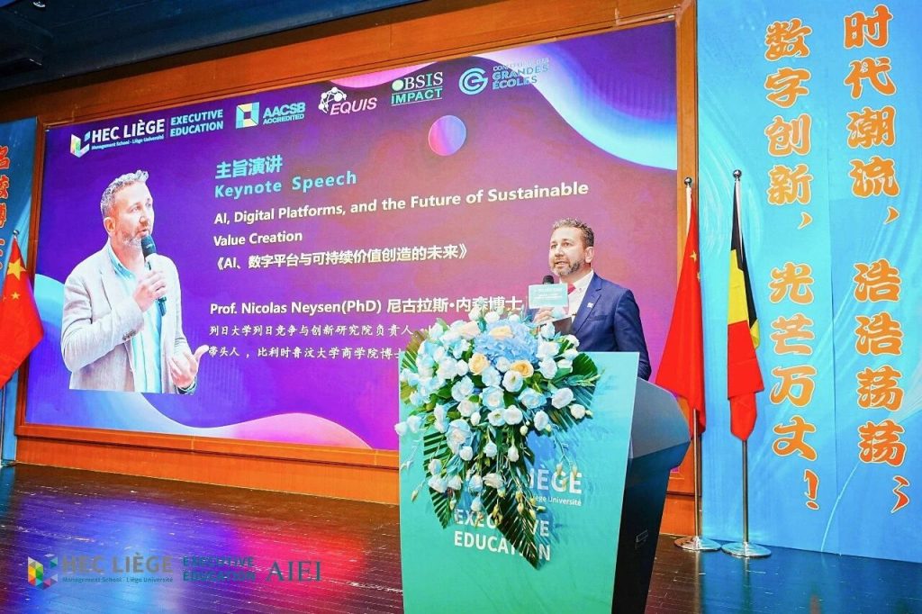 ▲2025年11月22日,在深圳举办的《智驱未来 ——AI 时代企业数字化创新发展》学术论坛上,HEC列日高商数字化转型负责人尼古拉斯·内森教授以《AI、数字平台与可持续价值创造的未来》为题作主旨演讲。